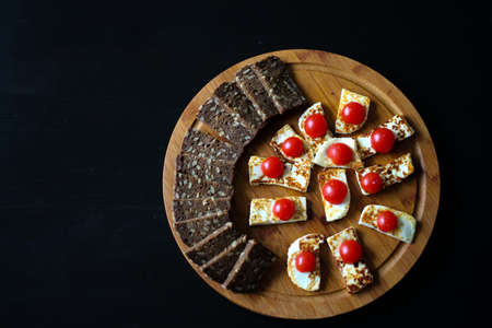 Top view of grilled homemade cheese with cherry tomatoes and sliced black bread with sunflower seeds. All on a round wooden Board on a black background.
