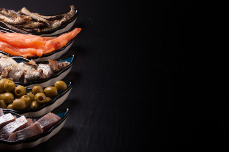 Assorty of fish and olives on oriental dish.