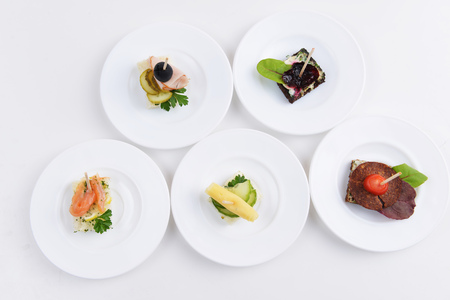 Buffet table. Assortment of canapes. Banquet service in restaurant. Catering food, snacks on white plate.