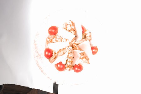 Colorful pita bread squares with melted mozzarella and fresh tomatoes on a white background