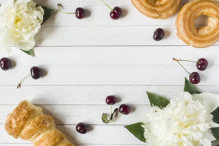 Frame custard cakes cherry peony flowers. Copy space