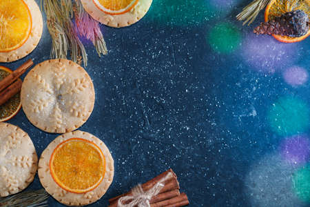 Top view of mince pies, baked crumbly pastry packed with fruits, tangy peel and spices. Concept of Christmas baking. Copy space.