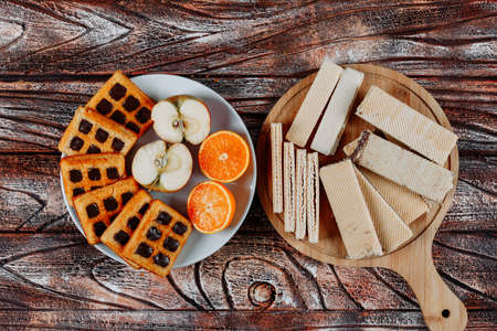 Top view cookies and waffles in plate with orange and apple on wooden background. horizontal
