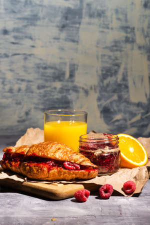 glass of orange juice and a croissant with raspberry jam on wrapping paper. Close-up.