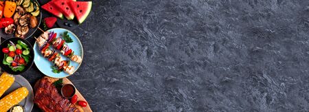 BBQ or summer picnic food side border over a dark stone banner background, top view with copy space