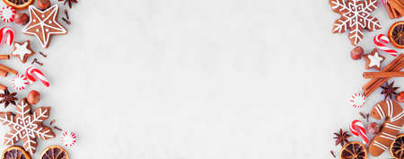 Christmas baking double border with cookies, peppermints and spices. Top down view over a white marble background with copy space. Holiday baking concept.