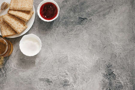 Jewish religious holiday Shavuot with dairy products, cheesecake, pancakes, fruits