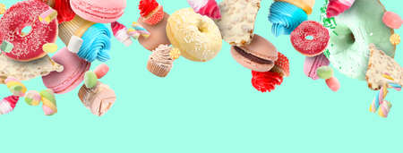Many flying donuts and sweets on turquoise background