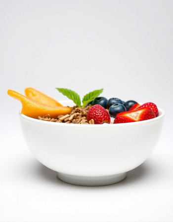 healthy meals, A mixed salad with preserved salmon, orange and strawberry served in a white bowl placed on a white table. a phone, that turns off a screen, placed in foreground.