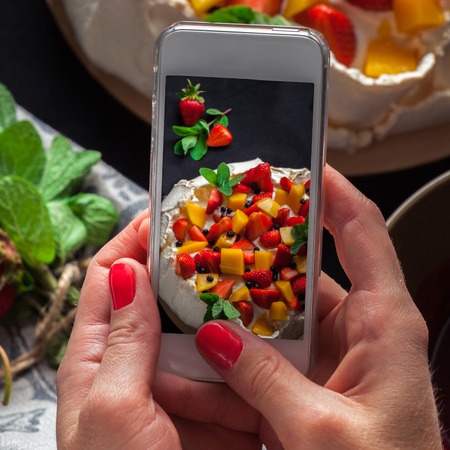 Food photography sweets dessert from smartphone on the dining table / Home made food photo for post in social networks mobile phone photo , selective focus