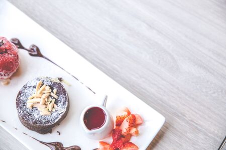 Soft focus a little white jar and blur the chocolate lava dessert with strawberry ice cream and strawberry jam on a white plate. Copy space for text.