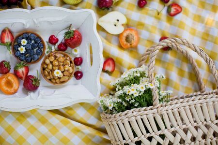 Picnic at the park. Fresh fruits and tarts on a white wooden tray, straw bag with white chamomiles on the yellow tablecloth
