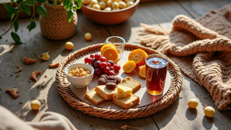 Rustic breakfast setting with fruits, bread, and juice on a woven tray in sunlit room. That the image is generated using AI.