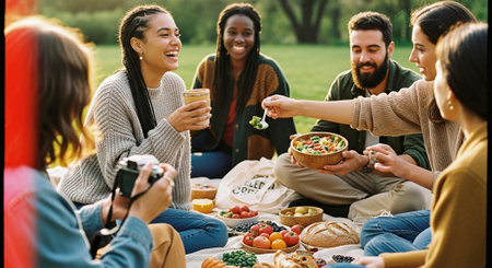 A group of friends enjoying a picnic in a park, sharing food and drinks, laughing and having a good time