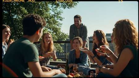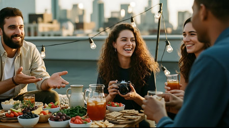 Group of friends having dinner together at rooftop party, talking and laughing