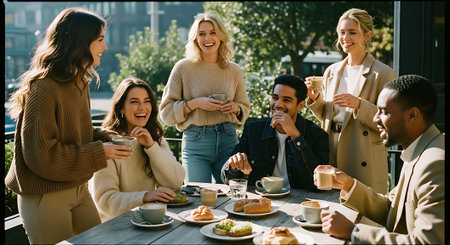 Group of young people having breakfast in a cafe, drinking coffee and having fun