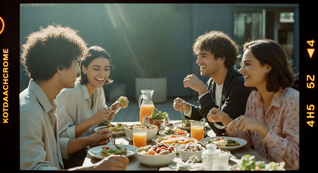A group of friends enjoying a meal together outdoors on a sunny day