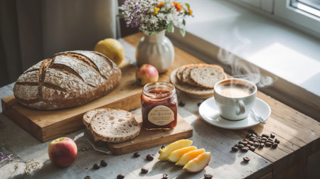 Breakfast with coffee, bread and jam on table in morning light