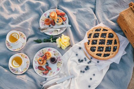 Beautiful picnic with pancakes, jam, american pie and tea on sunset at beach.