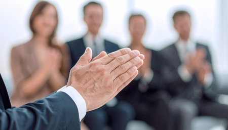 A close-up shot of hands clapping, with a blurred group of people in suits in the background, suggesting a business meeting or presentation.