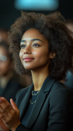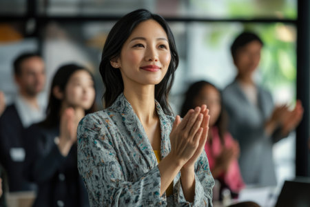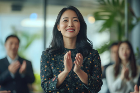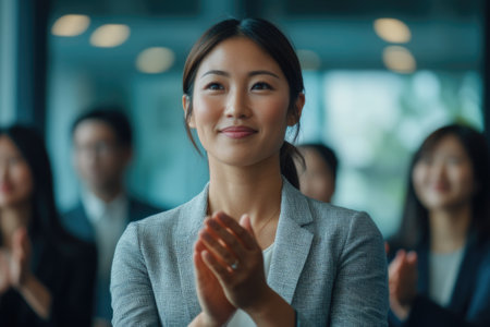 A professional and confident woman clapping, portrayed in a corporate environment symbolizing success, inspiration, and motivation.