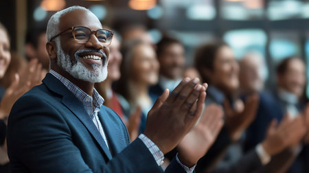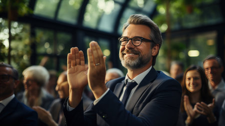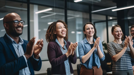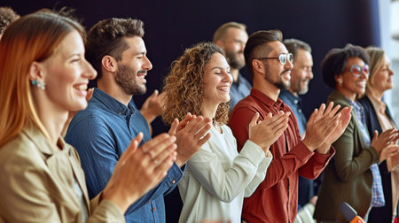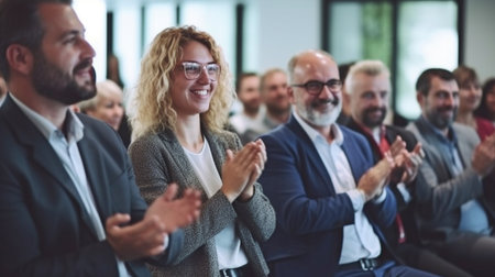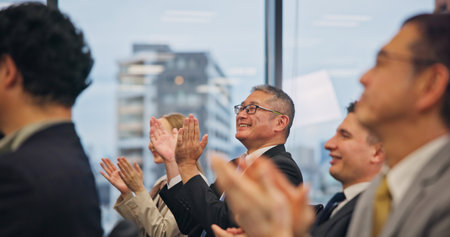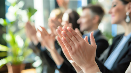 Business people applauding, showing appreciation and celebrating success during a corporate event, conference, or team meeting in an office environment
