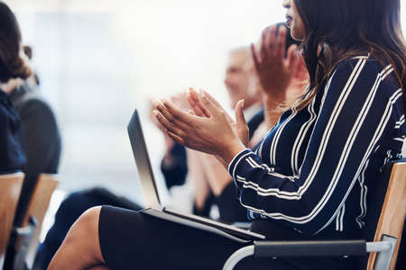 Well done. Cropped shot of a group of businesspeople applauding while sitting in a presentation.