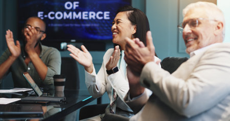 Applause, meeting and business people in boardroom with congratulations, achievement or celebration. Discussion, clapping hands and team of corporate distributors with ecommerce planning in office.