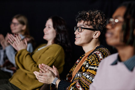 Group of young adults of diverse ethnicities sitting in row clapping hands and smiling, focusing attention forward, blurred background suggesting indoor event or presentation