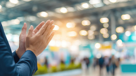 A businessperson's hands are seen clapping in a large conference hall, with a blurred audience in the background, creating a lively and engaging atmosphere.