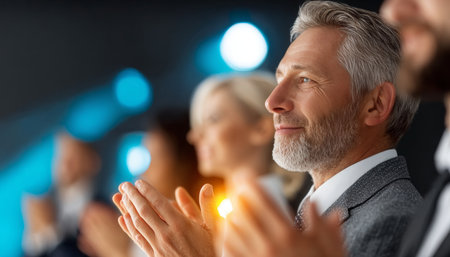 A contemporary business person clapping their hands at a conference or corporate event