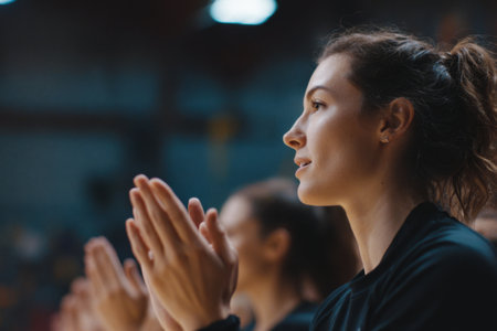 A young female athlete enthusiastically claps her hands while cheering for her team during an intense basketball game at a gym. The atmosphere is electric with anticipation.