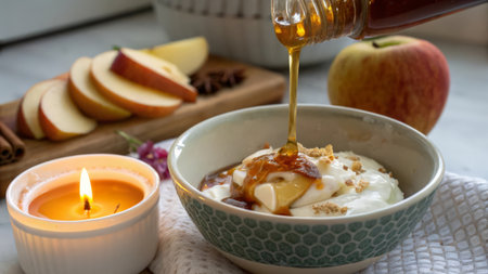 Healthy breakfast with oatmeal, yogurt, apple and honey.