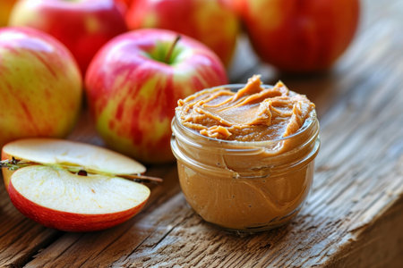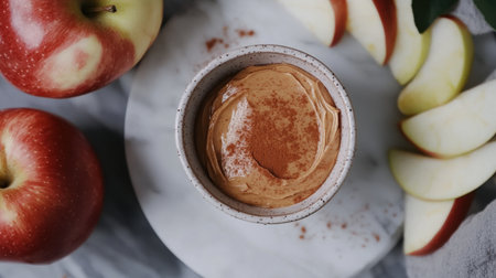A close-up view of fresh red apples arranged next to a bowl of creamy nut spread, creating a healthy and delicious snack option for any time of day.