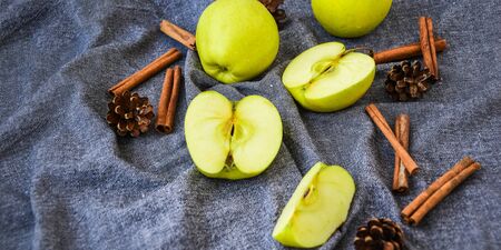 green golden apples or Granny smith with cinnamon sticks pine fir cones on kitchen towel, preparing food, dessert, healthy nutrition, autumn time