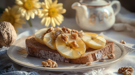 A beautifully arranged slice of whole grain bread topped with fresh apple slices and walnuts, highlighted by soft morning light and floral accents.