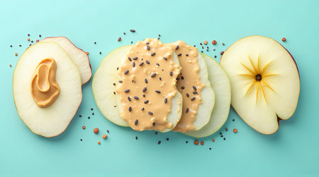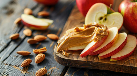 Enjoy a vibrant display of fresh apple slices paired with creamy peanut butter, ideal for healthy snacks or nutritious meals. Perfect for food photography and lifestyle content.