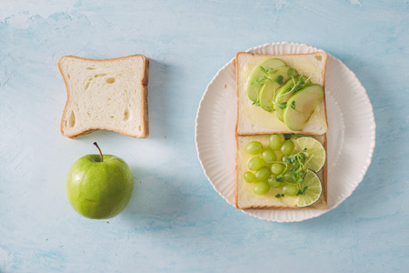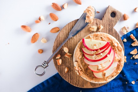 Apple crisp bread toast with apple slices, peanut butter, almonds and walnuts. Healthy breakfast concept in a high key.