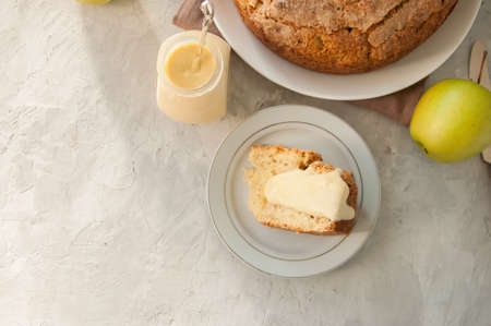 Slice of Irish apple pie on a white plate with vanilla custard sauce. Festive dessert for St.Patricks Day.