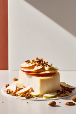 AI Generated. Gourmet presentation cheese block topped featuring fresh apple slices as well as a delightful sprinkle of nuts
