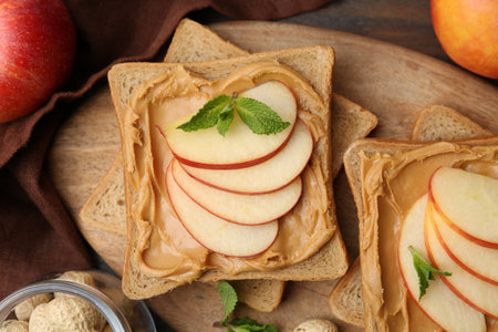 Tasty sandwiches with peanut butter, apples and mint on table, flat lay