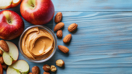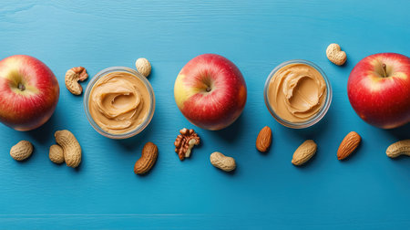 A top-down composition of sliced red apples, peanut butter, and mixed nuts, creating a healthy and tasty snack on a blue wooden table.