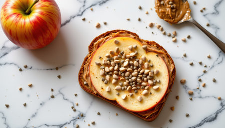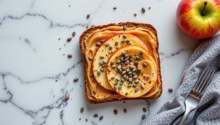 Delicious slice of whole-grain bread topped with creamy peanut butter, fresh apple slices, pumpkin seeds, and served with a vibrant red apple on marble background