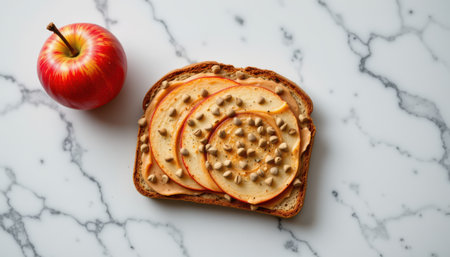 Delicious peanut butter toast topped with spiral apple slices, chia seeds, and a red apple on a marble background suitable for healthy eating and breakfast ideas