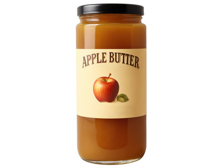Apple Butter Sauce A sweet apple butter sauce in a transparent jar, with a golden amber color and smooth texture.