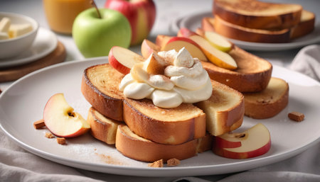 culinary photography, a tasty and easy breakfast idea featuring homemade cinnamon toast with cream cheese and apple slices on a ceramic plate, with copy space in the background