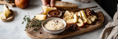 A breakfast board is presented on a wooden platter, featuring fresh fruits like apples and berries, along with a creamy treat and syrup for a satisfying morning experience, banner