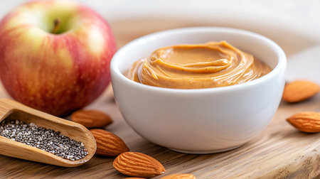 Peanut butter in a bowl with chia seeds and apple on wooden background