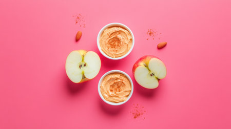 Brightly colored apples sliced in half sit next to creamy nut butter on a vibrant pink surface, ideal for showcasing healthy snacks and delicious desserts.