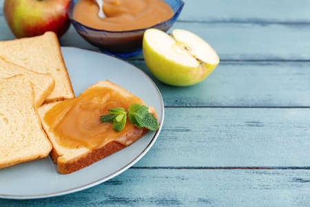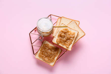 Toast with sweet apple jam in plate on color wooden background